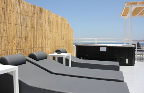 Kamara Sea View Villa is placed in Kamari,overlooking the sea and the mountain,few steps from the beach.It has a roof terrace with hot tub and sitting area