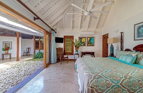 Karma Bay’s six bedrooms are all air-conditioned with individual media systems and private en suite bathrooms featuring waterfall showers and two of the en suites boast extended al fresco shower areas. Four of the bedrooms have king-sized beds, while two have twins which may be configured as kings. The waterfront-facing bedrooms all open out onto a private terrace area. Four of the bedrooms are joined to the main house by elegant covered pavilions that offer views of the lawns and the ocean. All bedrooms have cell phones for ease of calling the butler.