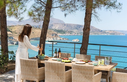 Beautifully situated property right above the water, with breath-taking views to the bay and beach of Kera, Souda Bay, the White Mountains, the open sea, and the Akrotiri. Nestled among native pine and eucalyptus trees, the villa is perfectly positioned on extensive grounds, offering stunning vistas from all rooms and outdoor areas, and amazing sunsets. The location is quiet and peaceful with the soothing lull of the sea, and the plot is completely private.