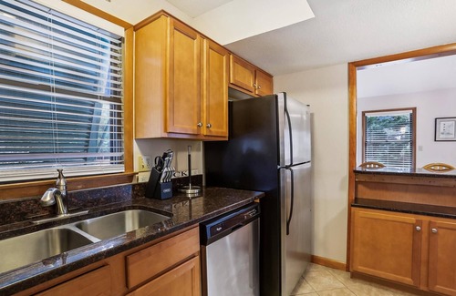 The modern kitchen, outfitted with sleek stainless steel appliances, rich wooden cabinetry, and elegant granite countertops, beckons you to channel your inner chef and whip up delightful meals. The sunlit window ensures the space is drenched in natural light, casting a warm and inviting glow throughout. Whether you're brewing a morning cup or preparing a sumptuous dinner, the kitchen at Keepers Loft ensures a culinary experience that feels just like home, but with the added touch of vacation luxury.