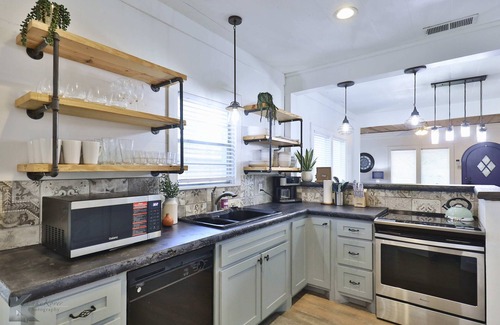 Check out this unique 4-bedroom restored home, located a few minutes WALK to the ACU campus w/ 9 beds! Also just 10 min drive to Abilene airport, Abilene Zoo, downtown Abilene stores, I-20, Hendrick's and shopping. Features a King size bed in master, Queen Size in 2nd bedroom, Queen size bed in 3rd bedroom, and two bunk beds & trundle bed in the 4th Bunk bedroom, 3 parking spaces, XL back yard to play games, BBQ, w/ fire pit. Book now or Save ❤️ this listing to be alerted to promotional pricing!