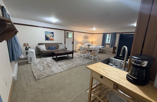 Suite includes outdoor lakefront view of Lake Wallenpaupack with patio, firepit, and grilling area. Suite sleeps 4 to 6 - with one (1) King bed in private bedroom, and one queen bed along with additional one (1) queen futon in oversized main room. Great for couples and families . Includes small private bath, living area, coffeemaker, microwave, refrigerator, stove and outdoor grill with lakeview patio area. Also included is a private boat dock, easily accessible with direct lake access for kayaks, canoes, jet skis (motorboats not included).