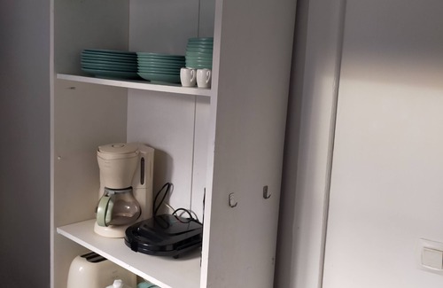 Aansluitend op de woonkamer is de keuken die van alle gemakken is voorzien: koelvriescombinatie, oven, magnetron, 2 pits kookplaat, afzuigkap, koffiezetapparaat, waterkoker, tosti-ijzer, broodrooster en staafmixer.