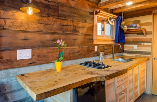 "La Casa De Madera" Near the El-Ceritto boarder is a custom handcrafted tiny/small house that is unique and one of a kind. Designed and built by Conscious Construction this house was built largely from reclaimed, re-purposed, and custom milled wood. Occupying a wonderful small piece of land where an eighty year old carriage house once stood. The original redwood siding from the carriage house was re-purposed and now clads some of the interior walls of the house giving a feel and texture you rarely see. The new house has magnificent San Francisco Bay views. Designed to capture the views of the Golden Gate Bridge and the beautiful sunsets overlooking brooks island and the expansive bay views. It was also designed to provide privacy with all the comforts of a home. From the easily accessible sleeping loft you can enjoy wonderful southern views with a glimpse of both the Bay Bridge and the Golden Gate Bridge. The kitchen has a two burner gas stove with a beautiful live edge counter top empathizing the organic feel of the space. Custom tiled shower and Alaskan yellow cedar clad the bathroom walls.
