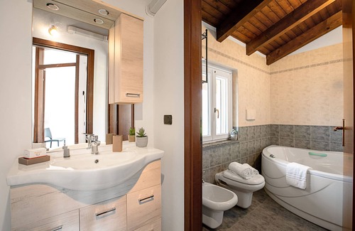 Bathroom: The bathroom is fitted with a shower in a jacuzzi bath, a bidet, a washbasin and a WC