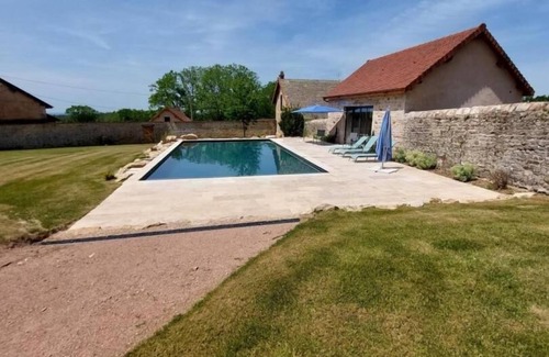 Authentic, carefully restored, centuries-old forge, located in the countryside on the prestigious grounds of the Château de Chaumont-Laguiche, an exceptional 17th-century heritage complex (family property since 1418) renowned for its sumptuous, listed stables, a literal masterpiece and equestrian palace built for the grandson of the King of France Charles IX (one of the largest private stables of the Ancien Régime in France). This vast property, considered a belvedere, also includes a castle and a romantic park with superb views of the Charolais mountains, the foothills of the Auvergne, and as far as Mont Blanc on a clear day. A bucolic setting in the heart of a magnificent, unspoiled haven of nature and greenery, on the edge of woods and meadows (with peaceful Charolais cows as neighbors), adjoining the vast wild forest of Avaise, protected as a ZNIEFF. Comfortable gîte. Ultra spacious. Rooms with noble dimensions. A warm, country feel blending tradition and modernity, in a gentle atmosphere combining classicism, vintage touches, and a contemporary feel. A large, exposed terrace overlooks a pleasant enclosed garden with a ping-pong table. Unobstructed views of the surrounding countryside. Access to the estate's beautiful swimming pool, walled garden, and private tennis court. Composition: Property comprising 3 fully independent gîtes and a historic building open to the public. Detached house. Fiber optic Wi-Fi. Oil-fired central heating. Ground floor: kitchen, living room, lounge, library lounge, 1 bedroom (double bed 160x200cm) with private bathroom (shower/toilet), separate toilet. 1st floor: 7 bedrooms (2 with double bed 140x190cm / double bed 160x200cm / 3 with 2 single beds 90x190cm including 2 extra beds / 1 single bed 90x190cm) including 2 with private bathrooms (1 shower / 1 bathtub), shower room (shower), bathroom (bathtub), 2 separate toilets. Enclosed garden (750m²) + terrace + private parking. Bicycle storage. Swimming pool 12x6m (access from 9am to 6:30pm) + shared tennis court. Amenities 2.5 km.