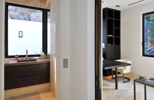 La Petite Sereine consists of five air-conditioned bedrooms with en-suite bathrooms. They are all furnished with queen size beds and open onto the terrace with views over the ocean or the vegetation. Three of them are on the main level, while the other two ones are connected and are located on the lower level with direct access to the second pool. Office areas and a tasteful decoration make these bedrooms true havens of peace where you will love resting at any time.