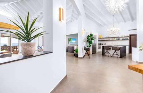 Stay in style and luxury at our six-bedroom villa on the Dutch side, perched on St. Maarten’s Pelican peninsula, surrounded by stunning mountains and ocean views of the Caribbean and the Atlantic. (The Villa also has a view of the Caribbean islands St. Eustatius and Saba). This walled, coastal contemporary complex has resort amenities offering the ultimate in luxury, privacy, comfort, and island ambiance.
