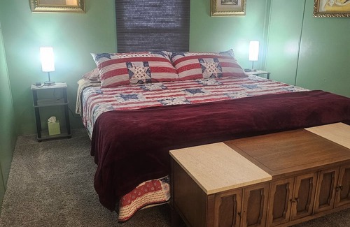 King suite w/large spa like bath. Bed 2 with queen bed next to hall bath. Full laundry, kitchen with recent appliances and greatroom with plenty of seating for everyone. Double Convection oven and beautiful new refridgerator will make your meals a breeze while you visit! Front porch features beautiful views of two ponds and surrounding forest. Plenty of room in this gated compound for all the toys.