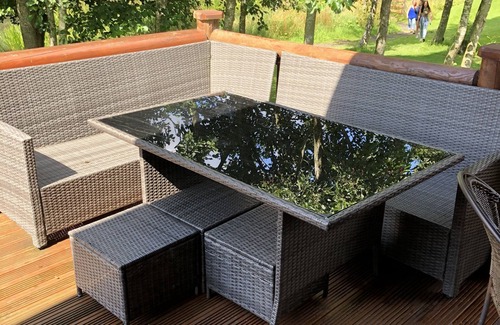 Luxury Lakeside log cabin with a hot tub on a veranda with a fabulous view!