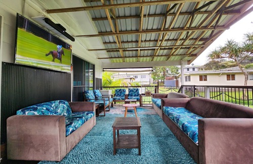 The 😀 House is a 3 bedroom + sleepout; with a huge verandah and has 2 bathrooms.