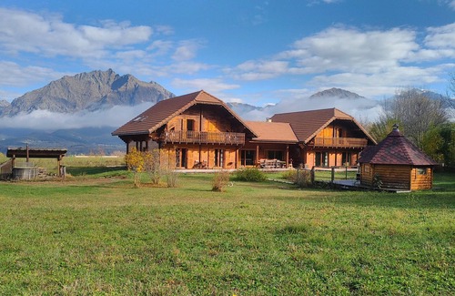 Très grand chalet en bois tout confort, face aux montagnes avec une vue a 360 degrés sur le massif du Devoluy et le plateau du Champsaur. Tranquillité assurée! 6 chambres avec chacune sa salle de douche, grande pièce à vivre, 2 saunas.