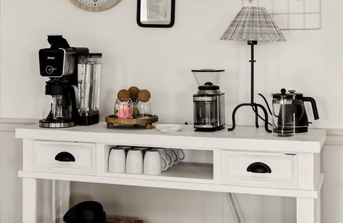 This home was specifically designed and furnished with large families in mind. Upon entering this large 5,000 sq ft home, you will find a large well stocked kitchen with a dining table for twelve. The bright and airy kitchen consists of a coffee bar, brand new appliances, dishes for adults and children and more. The coffee bar has a duo coffee machine for k-cups and for regular pots of coffee - both types of coffee are provided. For the coffee connoisseur there is an electric burr grinder and a French press - bring your favorite beans or ask us for recommendations for some of our local favorites to try during your stay. The stylish living room provides the perfect area to sit and enjoy the view of farmland right out the front door. On the first floor, there is a master bedroom with a King size bed, a walk in closet and an en suite bathroom.