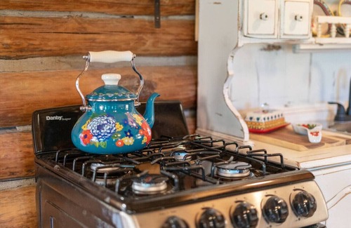 Come enjoy the beautiful Happy Hound real log cabin in Rudy, AR (or one of the other 3 cabins at the same location)! The cabin is set on 100 acres of forest & pasture. You'll love the cozy feel of the cabin. Comfortable queen size bed. Living area with couch and a chair to enjoy the ambience of the faux fireplace and smart tv. Spacious table for two right off the completely functional kitchen with nearly fridge, range with cooktop and oven, coffee maker with coffee and toaster.