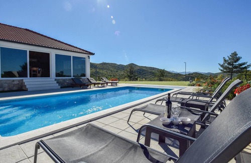 In the Dalmatian hinterland, near Sinj, surrounded by unspoiled nature, awaits you this beautiful vacation home. The house is ideal for a pleasant family vacation and extends over three floors (external stairs). On the ground floor there is a kitchen with living room and a bedroom with separate outside entrance and private bathroom. On the first and second floor there are two more bedrooms and another kitchen with living room and bathroom. On the large property are placed two more objects, one provides fun and entertainment and in the other building is placed the outdoor kitchen. You also do not have to do without refreshment on the hot summer days, you will find it in the pool in front of the house.