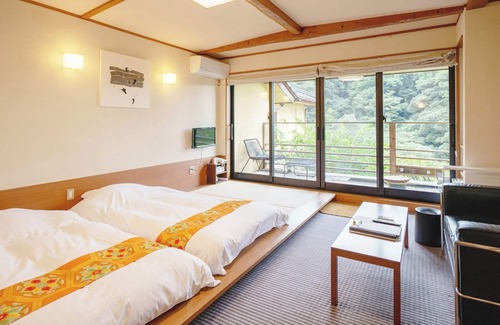 Private openair bath and family bath are free of charge Special Kuroge Wagyu beef and black pork kaiseki course meals and carefully selected sake A relaxing trip surrounded by nature / The Japanesestyle room is equipped with a low bed on the raised floor Recommended for guests who are not used to sleeping on futons or who are worried about the strain on their legs and back