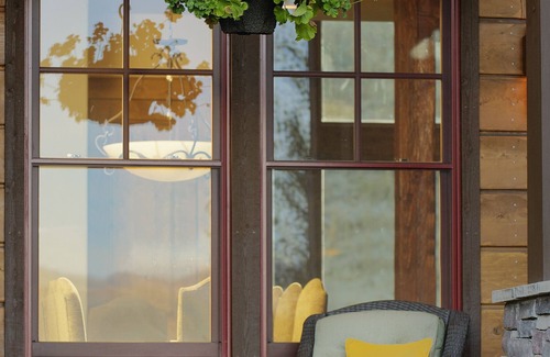 Approaching the house, guests are invited to sit and relax in a rocking chair or swing that grace the front porch - the perfect place to enjoy morning coffee and plan the day's adventure on a cool summer morning. The sound of a horse's whinny can be heard from the small pasture next door. Inside, the foyer opens into the home’s spacious living areas. Near the entryway, a large dining table comfortably seats ten and a private office houses a stately desk and bookcases. The great room offers comfortable seating around a wood-burning fireplace and a chess set.