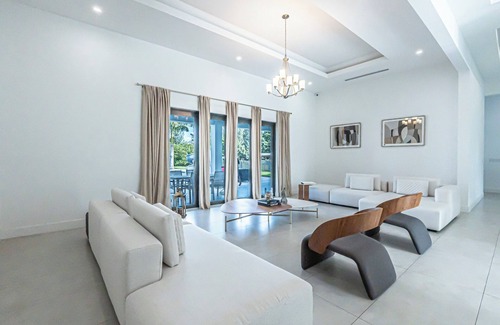 Spacious Interior: Enjoy an open-concept layout with sleek contemporary design, high ceilings, and abundant natural light. The main living area flows seamlessly into the fully equipped gourmet kitchen and bar, featuring top-of-the-line appliances, marble accents, and large islands perfect for entertaining.