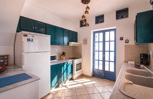 The Villa at Kastelli Bay is one of the very few vacation rentals in Kalymnos that is on the water. You are just steps away from a thatch shaded platform, right on the crystal clear waters of the Aegean Sea. The property is a pleasant retreat in Kalymnos, away from the crowd but conveniently located just 1 mile from the popular town of Massouri where you will enjoy restaurants and tavernas, cafes, bars, shopping and a public beach. The residence can accommodate a total of 8 persons.