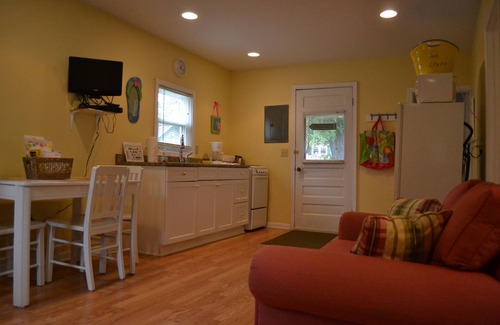 Each of the Little Yellow Cottages feature a screened in porch with seating, a living room with TV & soft seating, a full kitchen (plates, bowls, utensils, pots/pans, etc.), air conditioning and/or heat, and a private bath with shower. Cottages are available in both one bedroom and two bedroom configurations and can accommodate up to six guests. Outdoors you will find a fire pit, outdoor grills, and picnic tables and chairs. You are welcome to enjoy the space outback, as well as your own private patio with outdoor seating. You can purchase wood, charcoal, and other essentials for your outdoor fun just a few minutes from your cottage.
