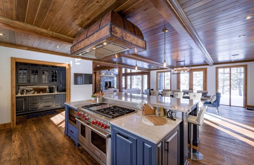 The glorious great room boasts floor to ceiling windows and vaulted ceilings overlooking the lake, a towering stone wood-burning fireplace and a hidden flat screen TV that ascends out of the floor with the push of a button!