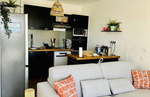 Magnificent T2 Type Apartment Terrace for 4 people, located on the 1st floor without a lift, within a secure residence with swimming pool, bicycle storage and private parking. This lovely rental offers: An Entrance with wardrobe, an independent suspended toilet, a bright living area with Television, a convertible sofa 160cm and its fitted open-plan kitchen: oven, microwave, dishwasher, ceramic hob, fridge/freezer, Nespresso, kettle, toaster, ...and storage. All overlooking a superb 20m² terrace offering an unobstructed view of the Ocean Dune worthy of a postcard.