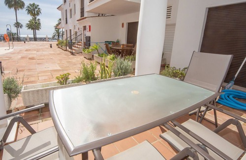 Located in the very popular beachfront complex of Marina Real this ground floor, two bedroom apartment comes with two full bathrooms and a fully fitted kitchen with washing machine and dishwasher. The apartment is also fully air conditioned and has direct access to the upper terraced swimming pool, perfect for a family holiday.The complex itself has two swimming pools, underground parking, 24 hour security and is just a short stroll to the marina.Communal facilities are subject to availability.
