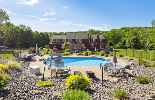 Our large house offers the perfect retreat for families & groups seeking a memorable getaway. Nestled on 11 beautiful acres in a peaceful and charming neighborhood, you'll love the resort-like amenities, such as the pool with water slide & jacuzzi jets, and the large patio with ample seating & a built-in firepit. Very private, yet close to great shopping, restaurants, farms, and more, plus it's only 1 hour from NYC.