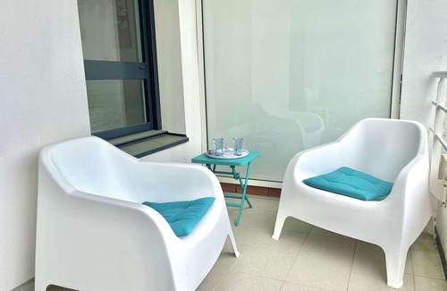 Living room with television, sofa bed for 2 people (duvet), large bay window opening onto a south-facing balcony of 10 sqm (garden furniture and deckchairs).