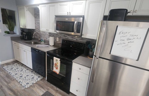 The private bedroom has a comfy Queen size bed with a closet. Enjoy a refreshing shower in the newly renovated bathroom and take advantage of the new kitchen with everything you need to cook inside or enjoy delicious offerings from local dining options. The living room has a couch which converts into Queen size bed and features a stone gas fireplace, and amazing views of surrounding mountains!