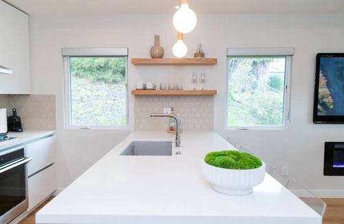Contemporary stylish space with a beautiful full size well-equipped kitchen, living space with fireplace and large screen smart TV, Roku, WiFi, air conditioning, full bathroom with tub, and one bedroom with a queen-sized bed.