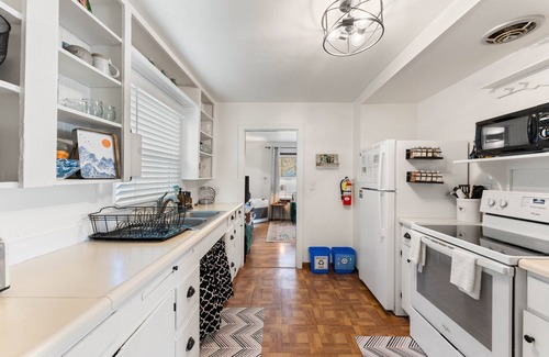 Our kitchen invites you to hang out and cook together, just like at home. It is white and bright, with sunlight streaming in during the day. You’ll have all the appliances, cookware, and dishware you will need. Plus lots of counter space and a butcher block cart.