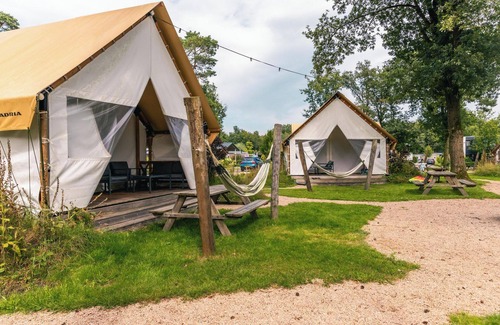 The wonderful camping feeling combined with the luxury of home makes a stay in Glampingtent 4 unique. The spacious glamping tent can be entered via a few steps. The living area has a dining area and open kitchen with induction stove, fridge and a filter coffee machine. Glamping tent 4 has 2 bedrooms with double beds, 1 on the first floor and 1 on the sleeping loft, which can be reached by a ladder. In the bathroom you will find a shower, sink and toilet. You can park 1 car at the glamping tent and you can use free Wi-Fi.