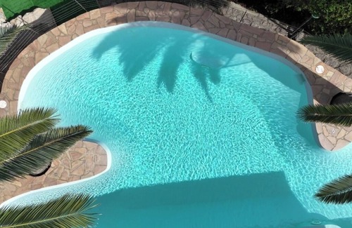 Moving on to the outdoor spaces we have a characteristic swimming pool, overlooking the sea. Along the edge of it there are two peninsulas from which two large palm trees rise. This means can swim in the pool in the shade of the palm trees.