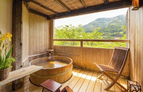 From the openair bath you can hear the murmuring of the Hida River and the shade of bamboo and maple leaves