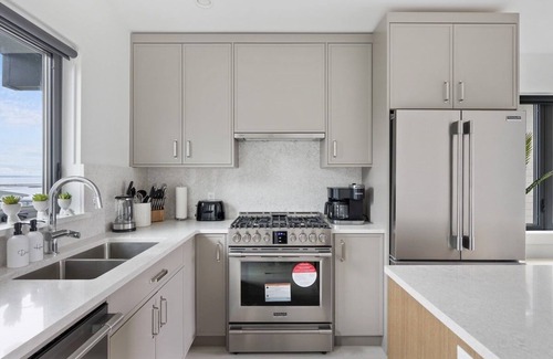 Frigidaire Professional appliances, gas range, dishwasher, quartz countertops & backsplashes.