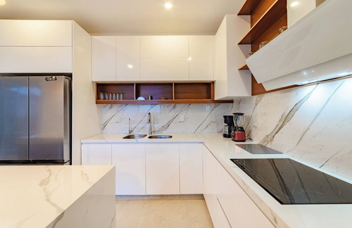 The open-concept living area is designed to bring the beauty of the outdoors inside. Expansive windows and sliding doors lead to a large terrace, where guests can enjoy panoramic ocean views. The living room is comfortably furnished with a dedicated dinning area. The fully equipped kitchen is a culinary delight, featuring modern appliances, granite countertops, and an island with seating. Whether you're preparing a meal yourself or having a private chef do the honors, this kitchen provides everything you need for gourmet dining.