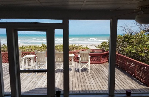 Enjoy this oceanfront two-level house with a fabulous view of the ocean! Featuring four bedrooms, two queen pull-out beds to sleep 12 guests and 2 1/2 baths. Enjoy the cool ocean breeze & ocean views as you relax on the upper sun deck of this elegant beach house or walking the beach in the ocean water. The house is located in a quiet part of south Cocoa Beach, close to restaurants and surf shops. The house is fully furnished with bedding, linens, towels and kitchen utensils, beach equipment for your enjoyment. This is the perfect place for large families and or family reunions in famous Cocoa Beach.