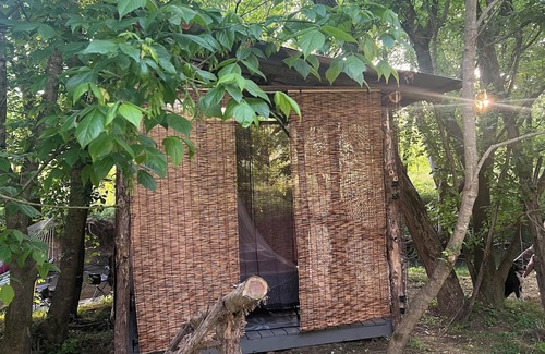 This is an off-grid rustic glamping treehouse feet away from the creek. Because of the breeze and moving water, we typically are not bothered by insects - but the roll-down bamboo shades, screen curtains, and mosquito netting are there to help (and look pretty!). The metal roof extends about 6" past the structure to help you stay dry if it rains - the tree canopy helps, too.