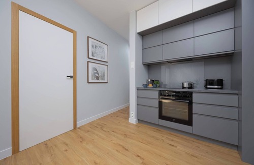 The 43 m² apartment is a functional and modernly furnished space, ideal for four people – a family or a group of friends looking to explore the charms of Warsaw. Conveniently located, it provides everything needed for a comfortable stay. The living room with a kitchenette features a comfortable, fold-out sofa that quickly transforms into a sleeping space for two. A 50-inch TV with cable channels and Smart TV ensures relaxing evenings. The kitchenette is fully equipped with a modern induction hob, an oven, a fridge with a freezer, a dishwasher, a toaster, and an electric kettle. A cozy dining table creates a perfect space for shared meals and conversations. The bedroom offers a comfortable double bed, guaranteeing restful sleep after a day full of experiences. The bathroom is designed with convenience and functionality in mind. It includes a shower with a built-in seat, which may be a useful feature for guests with limited mobility. A washing machine with a dryer function and a hairdryer are also available. The living room opens onto a balcony with outdoor furniture—an ideal spot for a morning coffee or an evening rest in the open air. Two air conditioning units, installed in both the living room and the bedroom, ensure thermal comfort. Fast Wi-Fi makes remote work and trip planning easy. For added convenience, a vacuum cleaner, an iron, and an ironing board are also provided. The building is equipped with an elevator and wide passageways, facilitating movement for families with strollers and guests with limited mobility. A parking space in the underground garage is available for motorists, while cyclists can use the bicycle racks located in the garage. Don't wait—book this comfortable apartment today and create unforgettable memories of your stay in Warsaw!