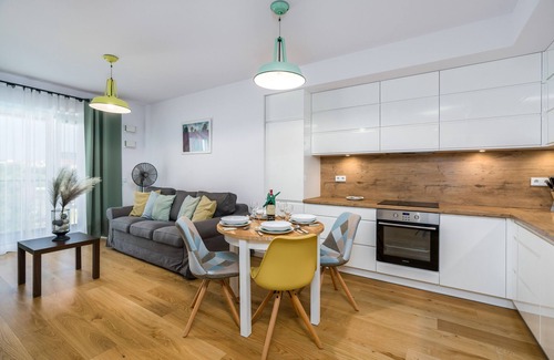 Beautiful apartment with one bedroom will be perfect for 4 persons or a couple! The apartment has fully equipped kitchenette with a dishwasher, oven, induction hob, electric kettle and all the necessary kitchen supplies and utensils for cooking and serving meals. In the bedroom you will find a comfortable bed and wardrobe. Bathroom is equipped with washing machine and shower cabin. Guests can take advange of fast Wi-fi and flat screen TV. The apartment also has a balcony with garden furniture. You can also stay here with your pet - cat or dog - for additional pay.