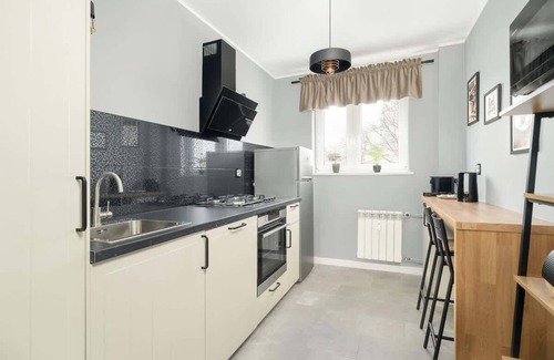 The stylish apartment is located on the second floor of a block of flats with elevator access. It is designed for six people, an ideal option for groups or large families traveling together. Two beds are located in the first bedroom on a comfortable bed, another in the second bedroom on a sofa bed, and another two in the living room also on a double sofa bed. A TCL TV is located in each bedroom. In preparing a delicious meal, the gas stove available in the separate kitchen is sure to come in handy, as well as an oven or microwave. On the balcony belonging to the apartment, you can enjoy a cup of coffee brewed in advance in the available capsule coffee maker. Don't worry about tedious dishwashing either, a dishwasher is also at guests' disposal. You can work remotely in the apartment - there is a desk in the second bedroom, and a high-speed WiFi connection is an added bonus. The bathroom has a bathtub with shower fittings, a washing machine, towels and a set of free toiletries. The apartment is assigned up to two parking spaces located in a fenced outdoor parking lot.