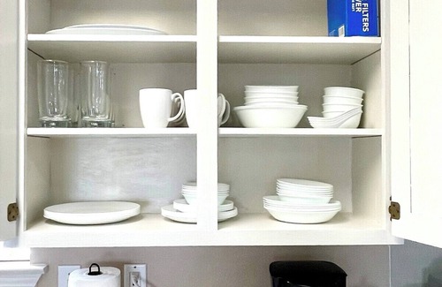 This is a full 2 BR/1 BA home (part of a duplex) stylishly decorated in soothing hues of grays, creams, and natural greens. The living space is open concept - with the kitchen separated from the living room by a counter height bar. The sofa has a full-size pull out section that will sleep 1 adult or 2 children. The 2 bedrooms have cloud-like pillow top queen size beds. The bedside tables have 2 USB plugs and the touch lamps have 3 brightness settings and more plugs in the base. Each bedroom has 2 windows with black out curtains for solitude during daylight hours
