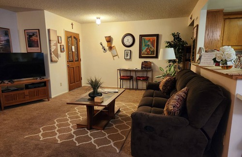 Roomy living area, 2 bedrooms plus den with XL twin bed, 2 bathrooms, sleeps 6. Handicap friendly, fully equipped, has whatever you need to cook a yummy meal. Large DVD movie selection. 2 block walk to the river, less than a mile to downtown. Quiet neighborhood you can hear the river from the patio table. Kernville has a award winning brewery about 2mi. from the house. Kernville is approx. 25 miles from Trail of 100 giants (Redwood forest).