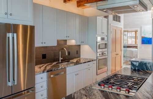 Stunning penthouse suite with exposed beams, brick accents, and whitewashed poplar walls. Enjoy harbor views from the rooftop deck. Two private master suites feature custom tile showers, one with a soaking tub. The spacious kitchen offers granite countertops and modern appliances. Relax by the gas-fired stove in the inviting living room. In-unit washer/dryer and elevator access included. Please note: no animals permitted due to owner's health.