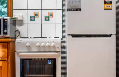 The bathroom or “Loo with a view” is in a separate building a few steps away, elevated and also screened so that you can watch the birds and wildlife from your vantage point. Please note we have composting toilets. Full kitchen facilities allow you to self-cater for all meals. Coffee and tea are provided. There is a common area in which you can enjoy the fireplace, barbecue or perhaps cook your own pizzas in the wood fired pizza oven (additional $25 for firewood).