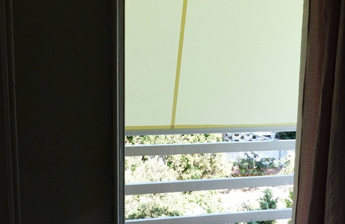 Two balconies overlooking the communal garden with manual awnings (one furnished with a small table, chairs)