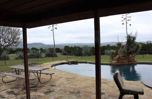 Pool, Hot Tub, Fishing in a stocked pond on the ranch, awesome views and tons of wildlife! Bar W Ponderosa has three separate homes all in one compound, great for family and friends to gather! You will not find a better view of the Hill Country or a more laid back setting! Relax in the pool or hot tub and enjoy incredible views of the Bandera hills in a very private setting. Watch the occasional pony, cattle, turkey, whitetail or black buck linger by..... Have a great time by the outdoor fireplace playing cards at the table, lounging in the outdoor furniture or playing Foosball....The "Ponderosa" (main home) is a 3/2 with a full kitchen and living area, sleeps 8. The "honeymoon cottage" is a 1/1 and sleeps 4. The Bar W nook is a 2/1 and sleeps 5.