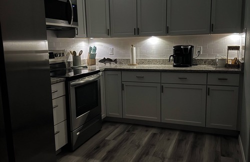 2 bedrooms and 2 full baths. King bed in master with private bathroom. Fully equipped modern kitchen, with stainless appliances. To maximize larger groups who want to spread out sleeping arrangements, the sectional is a pull out full size bed and extra linens/pillows are available in the hutch. There is also a pack n play in the guest room closet an high chair for guests to use if needed.