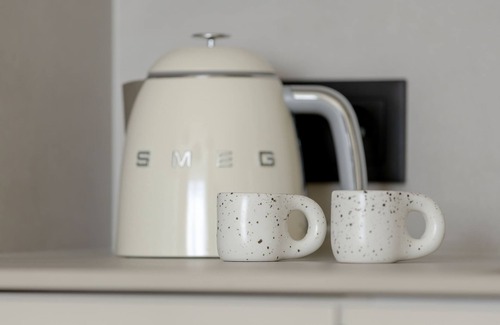 Induction hob, oven, microwave, fridge with freezer, electric kettle, capsule coffee machine, toaster, dishwasher, full set of dishes, kitchen utensils, kitchen island/table with chairs